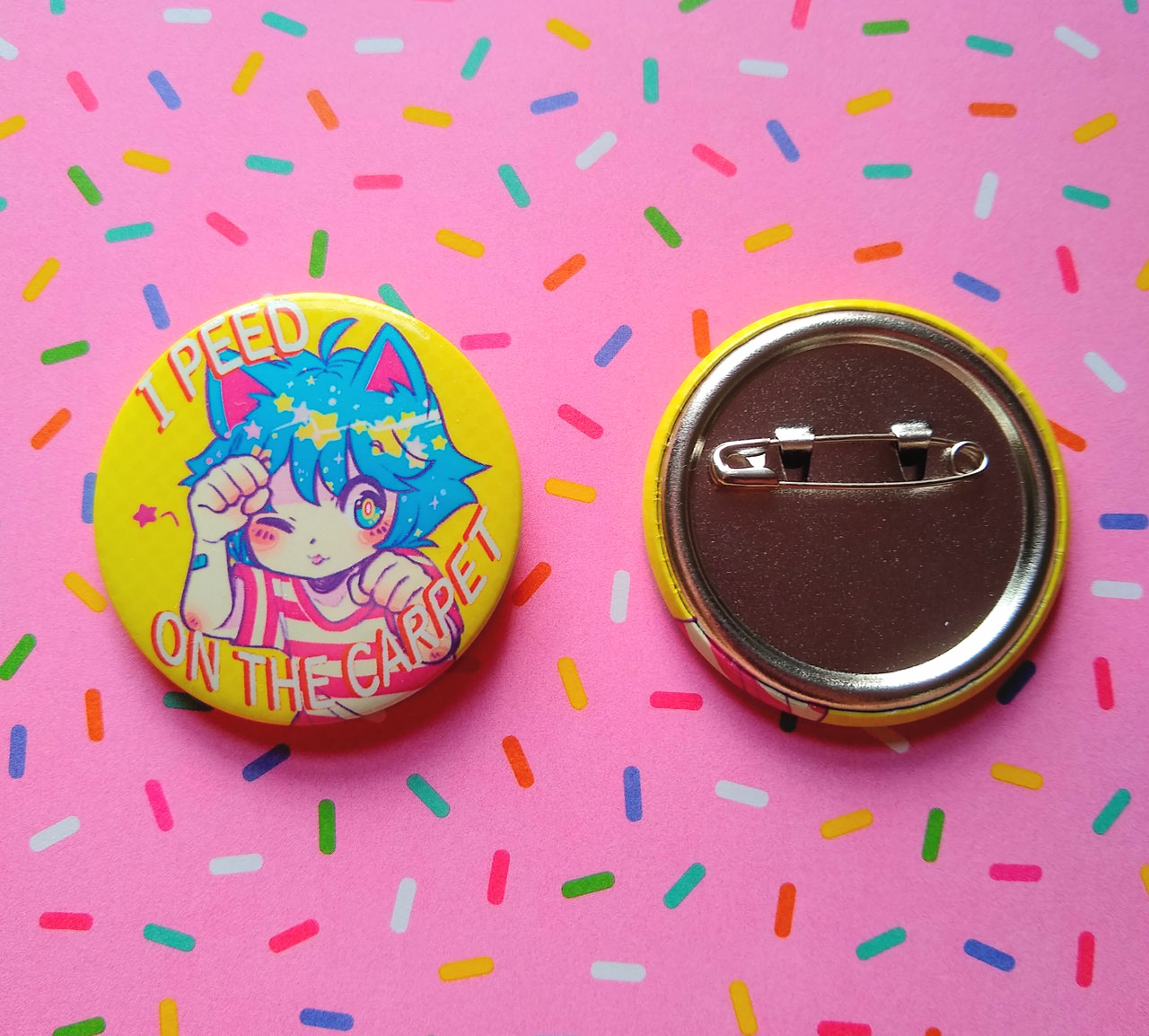 Please litter train soon. Printed on a round 44mm tinplate badge pin with a glossy finish.